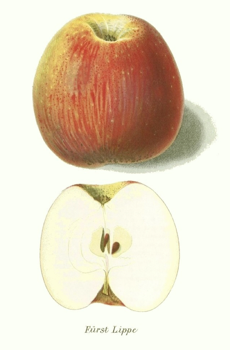 Apfelsorte Fürst LippeDie Apfelsorte Fürst Lippe wurde erstmals vom Pomologen Dr. Eduard Lucas 1872 in den Pomologischen Monatsheften beschrieben und dort auch farblich abgebildet (siehe rechts). Die Beschreibung enthielt die Information, dass der Apfel aus Veröcze stammt. Veröze lag in dem zu Ungarn gehörenden Königreich Slawonien, dem heutigen zu Kroation gehörendem Virovitica. Georg Fürst zu Schaumburg Lippe hat dort 1840 die Herrschaft Veröze käuflich erworben und vermutlich wurde die Apfelsorte nach Deutschland gebracht und auch vom Fürstenhaus weiter verbreitet. Die Sorte war verschollen und erst 2022 wurde festgestellt, dass eine unbekannte aufgefundene Apfelsorte sich als Fürst Lippe herausstellte. |