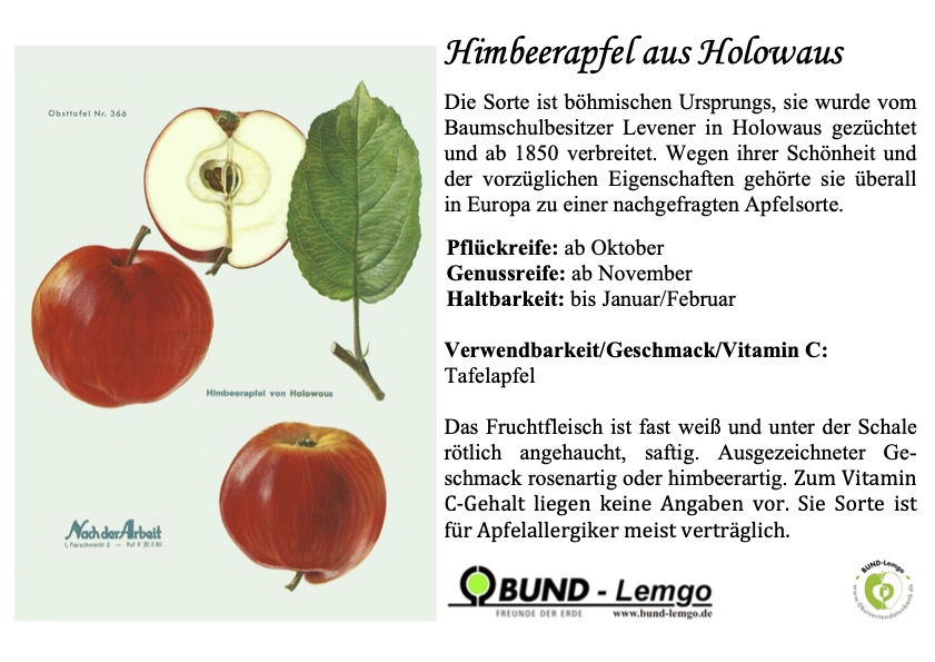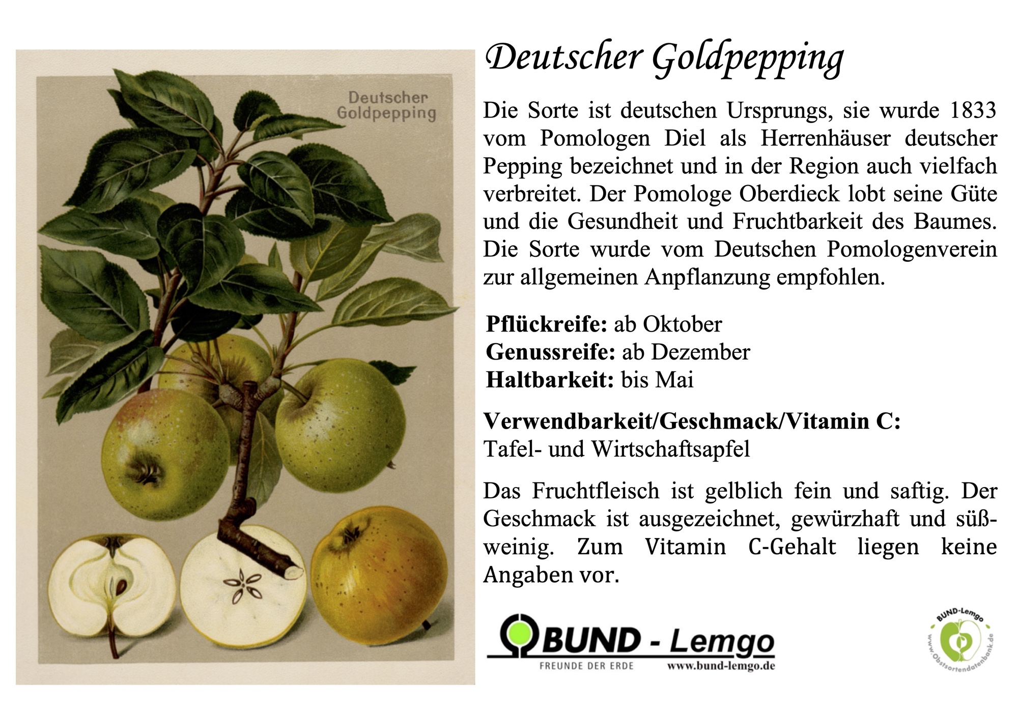 Pflückreife ab Oktober - bis 7 Monate Lagerfähigkeit - mittlerer Vitamin C-Gehalt - für Apfelallergiker meist verträglich - Polyphenole 1.630 mg/kg