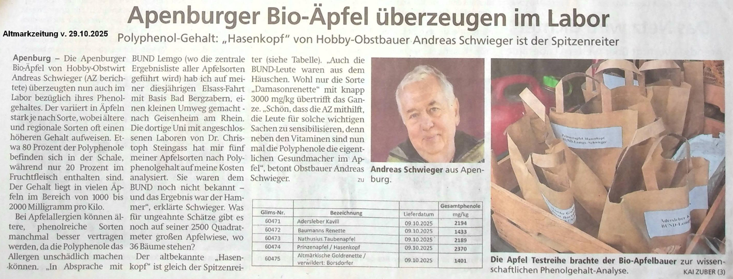 Aktueller Pressebericht vom Oktober 2025 zur Untersuchung des Polyphenolgehaltes von 5 weiteren alten Apfelsorten. An dieser Stelle recht herzlichen Dank an Andreas Schwieger aus Apenburg für die Unterstützung.
