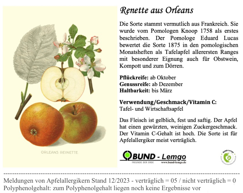 u.a. Alkmene, Altländer Pfannkuchenapfel, Ananasrenette, Danziger Kantapfel, Finkenwerder Prinzenapfel, Goldparmäne,Goldrenette Freiherr von Berlepsch, Goldrenette aus Blenheim, Gravensteiner, Prinzalbrecht von Preußen, Weigelts Zinszahler | ja |
